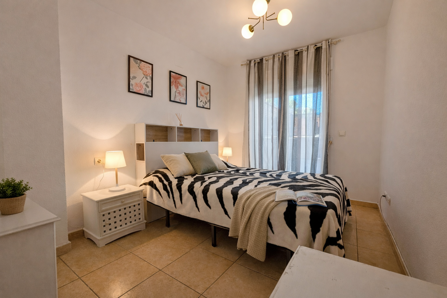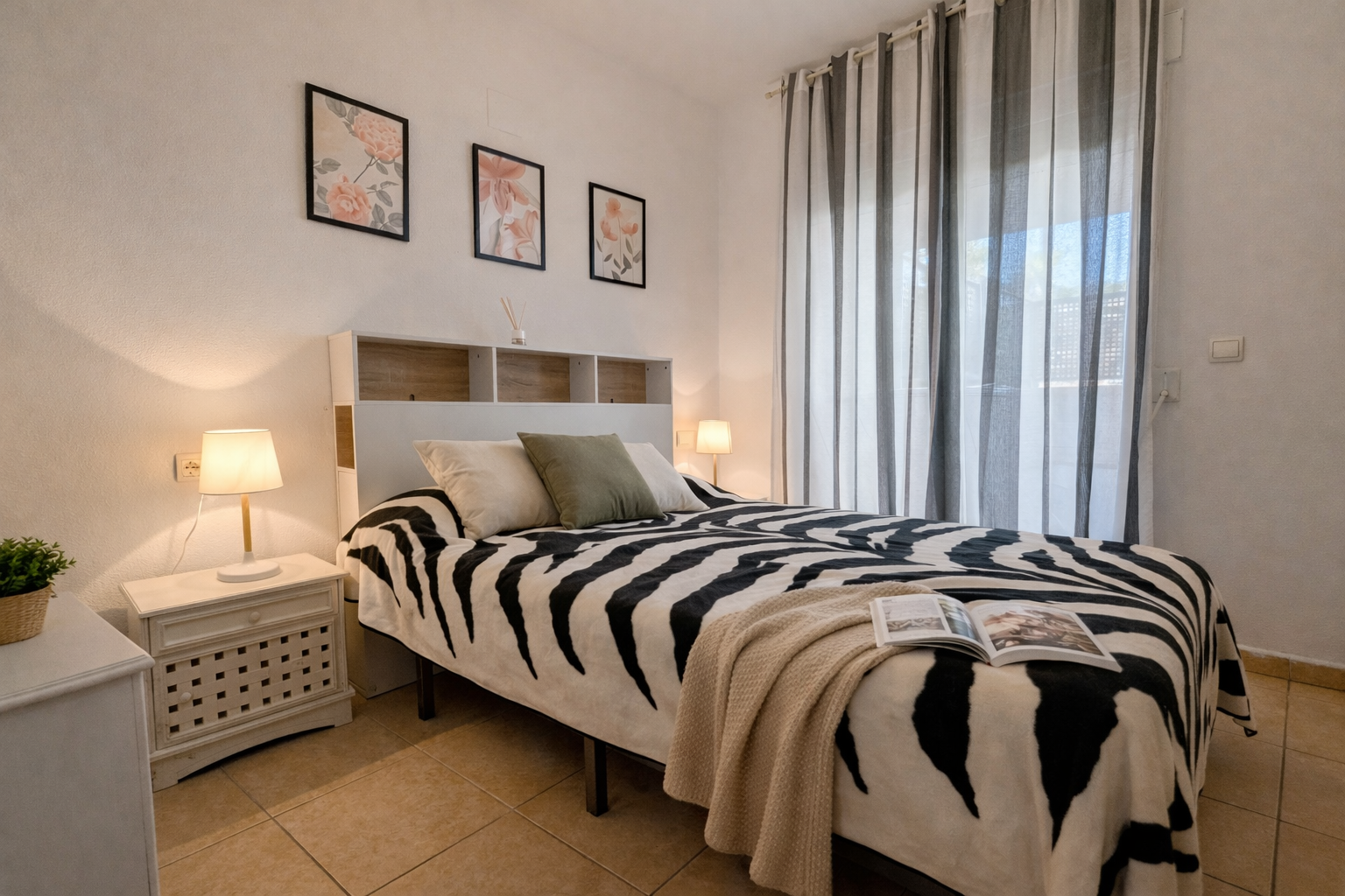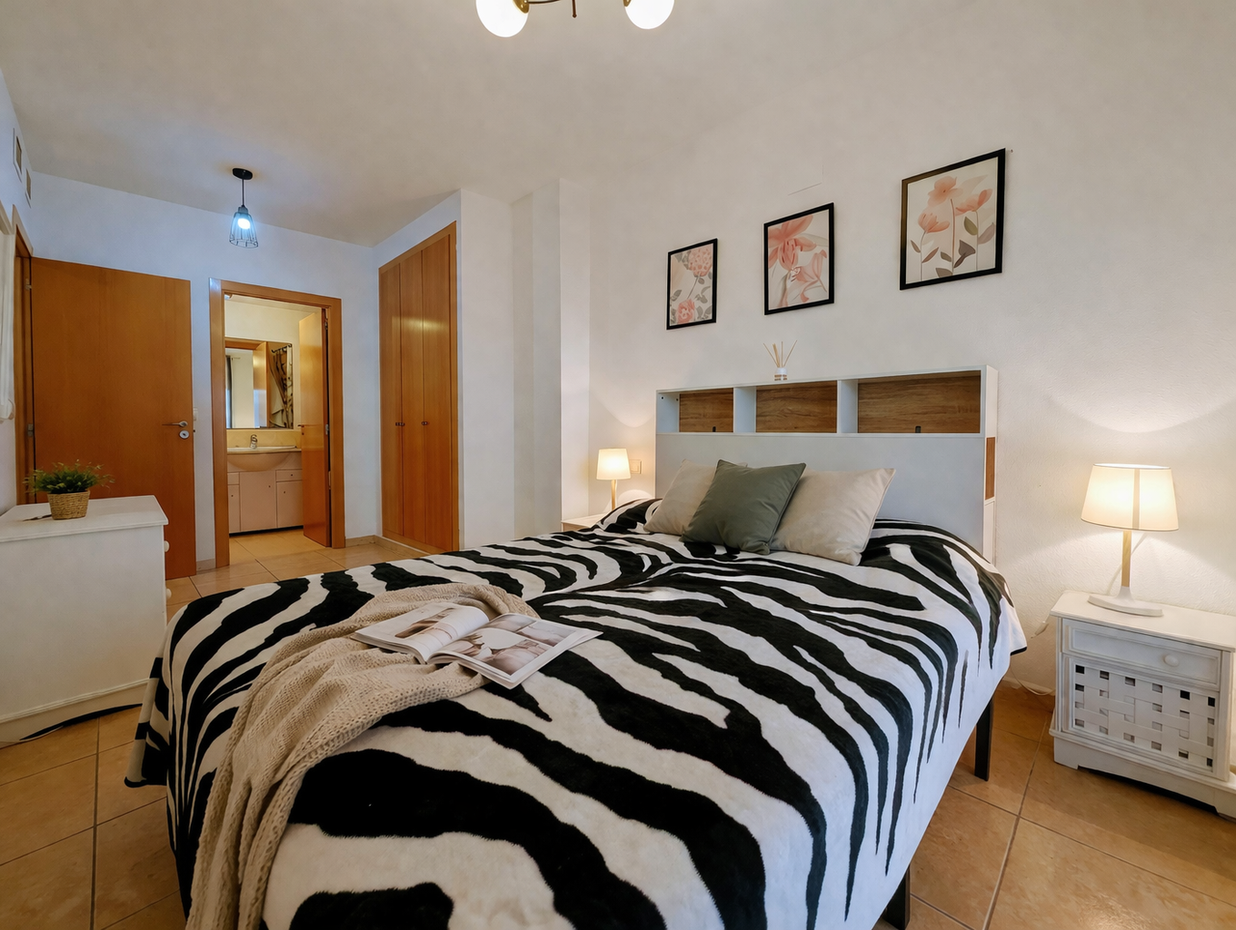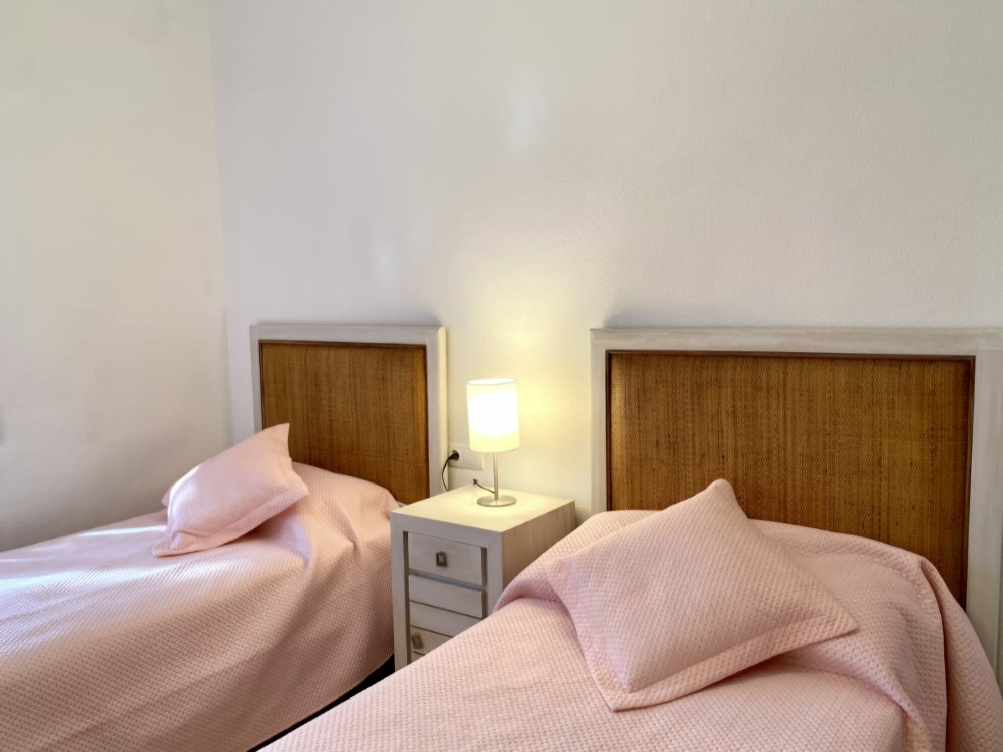 Das Apartment verfügt über 2 Schlafzimmer und 2 Badezimmer. Das Hauptschlafzimmer ist mit einem 150 cm breiten Bett, zwei Nachttischen, zwei Lampen, einer Kommode und einem en-suite Badezimmer mit Badewanne ausgestattet. Das zweite Schlafzimmer bietet zwei Einzelbetten à 90 cm, einen Nachttisch und eine Lampe. Beide Schlafzimmer haben Zugang zur Terrasse: das Hauptschlafzimmer über eine direkte Tür und das zweite Schlafzimmer über ein Fenster.