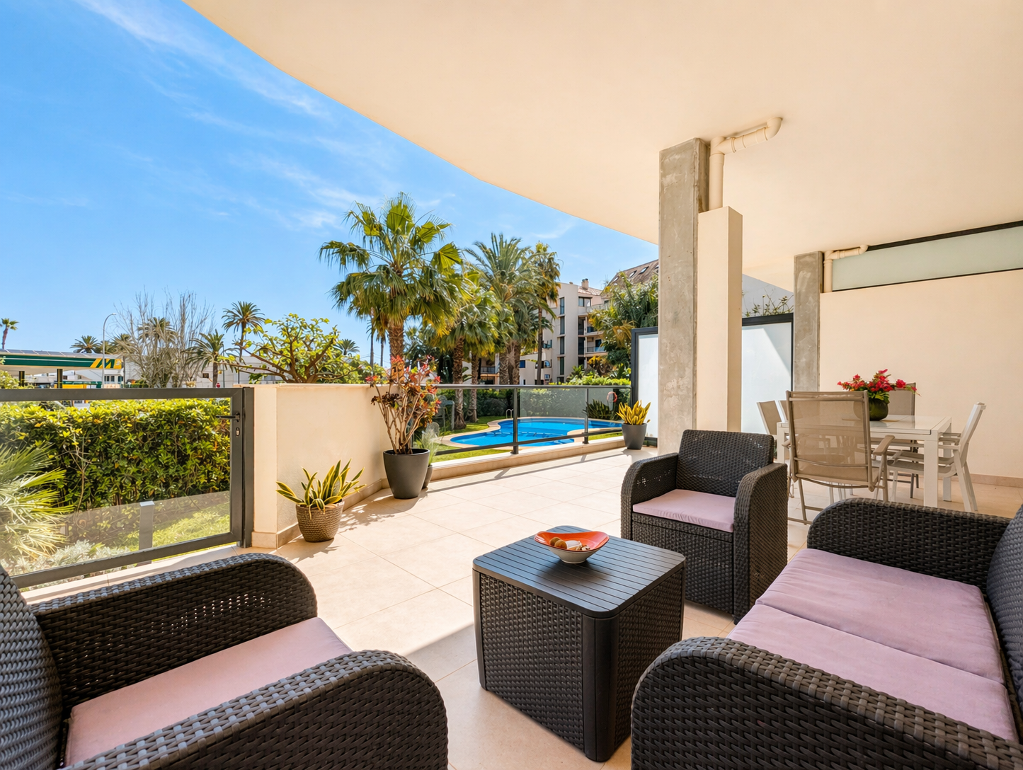 Amplia terraza con orientación al mar que cuenta con acceso directo a la zona común, jardín y gran piscina comunitaria. Muebles de exterior y zona chill out.